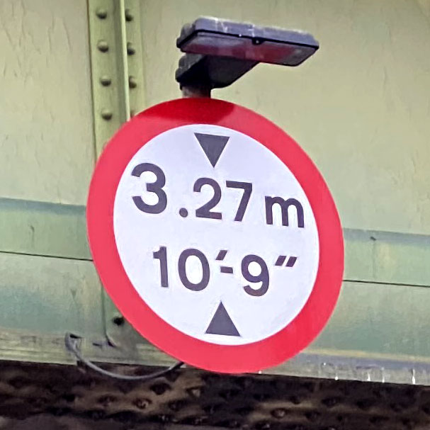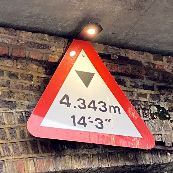 The UK is unique in prescribing that new height restriction signs on bridges and tunnels must give the clearance height in both metres and feet and inches.